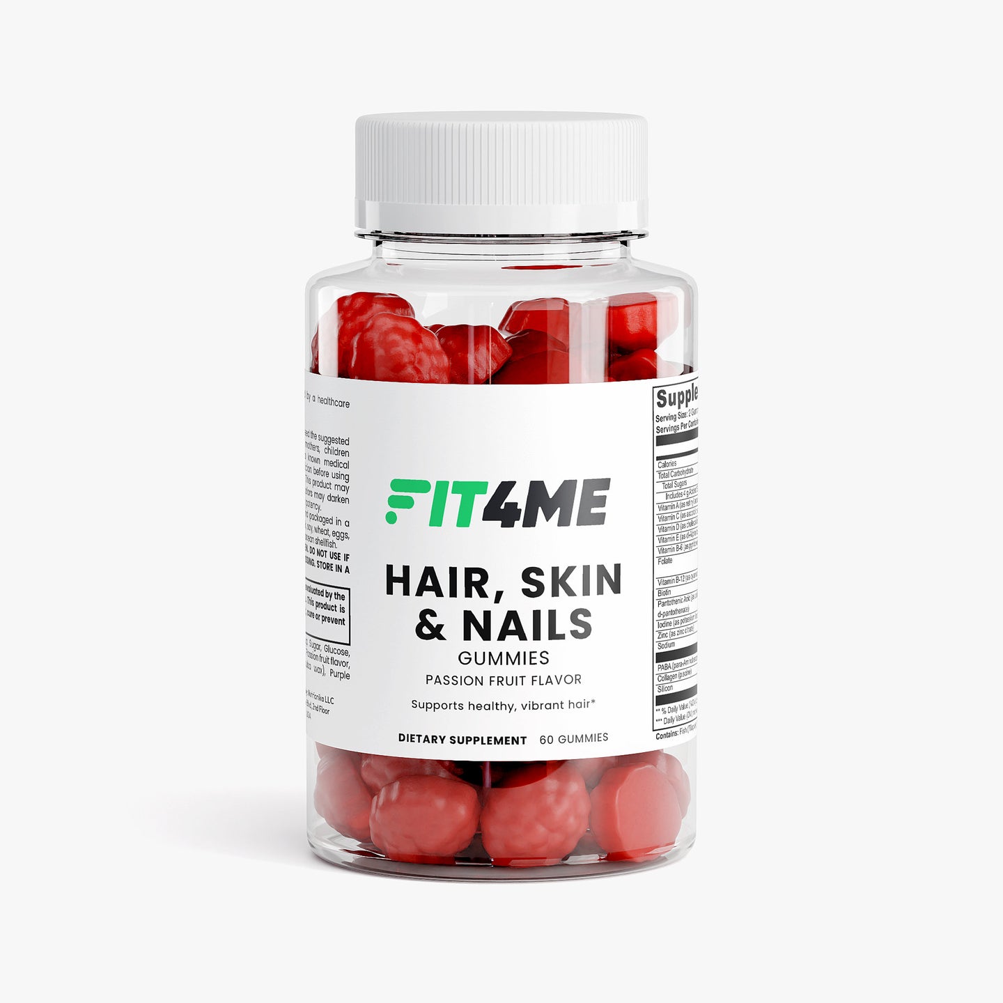 Vitamin A (as retinyl acetate), Vitamin C (as ascorbic acid), Vitamin D (as cholecalciferol), Vitamin E (as dl-Alpha tocopheryl acetate), Vitamin B-6 (as pyridoxine HCI), Folate, Vitamin B-12 (as cyanocobalamin), Biotin, Pantothenic Acid (as calcium d-pantothenate), Iodine (as potassium iodide), Zinc (as zinc citrate), PABA (para-Aminobenzoic Acid), Collagen (piscine), Silicon, Glucose syrup, Sugar, Glucose, Pectin, Citric acid, Sodium citrate, Passion fruit flavor, Vegetable oil (contains carnauba wax), Purple carrot juice concentrate